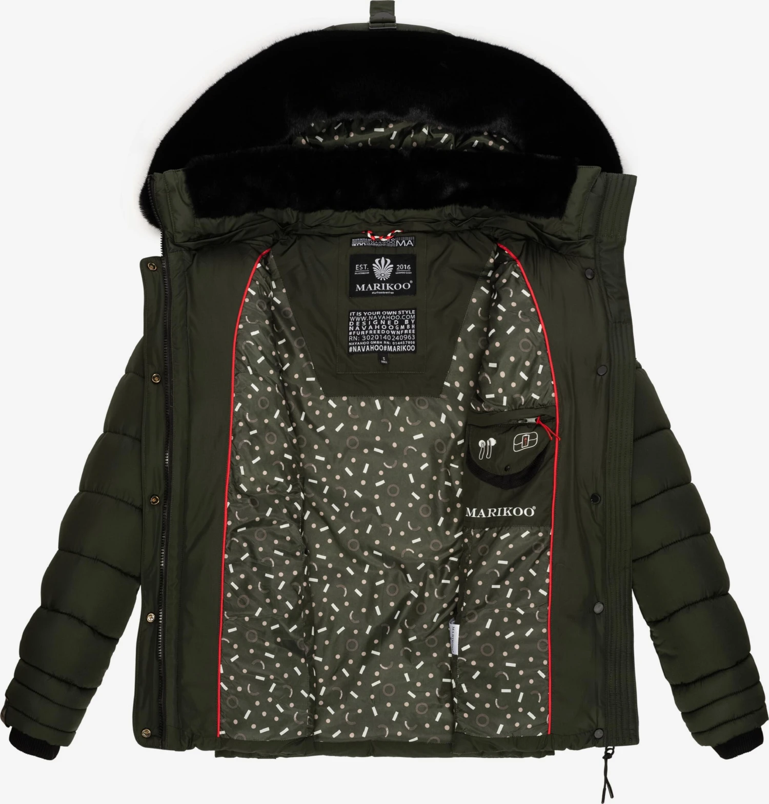 Matériau supérieur : 100% Polyester – PESDoublure : 100% Polyester – PESRembourrage : 100% Polyester – PESDoublure des manches : 100% Polyester – PESFausse fourrure : 90% Polyacrylique – PC, 10% Polyester – PESPays d’origine : Chine